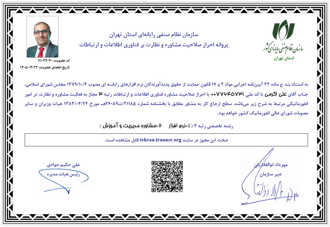 - مشاور رتبه ۳ نظام صنفی رایانه ای در رشته های نرم افزار و مشاوره مدیریت و آموزش از سال ۱۳۹۵